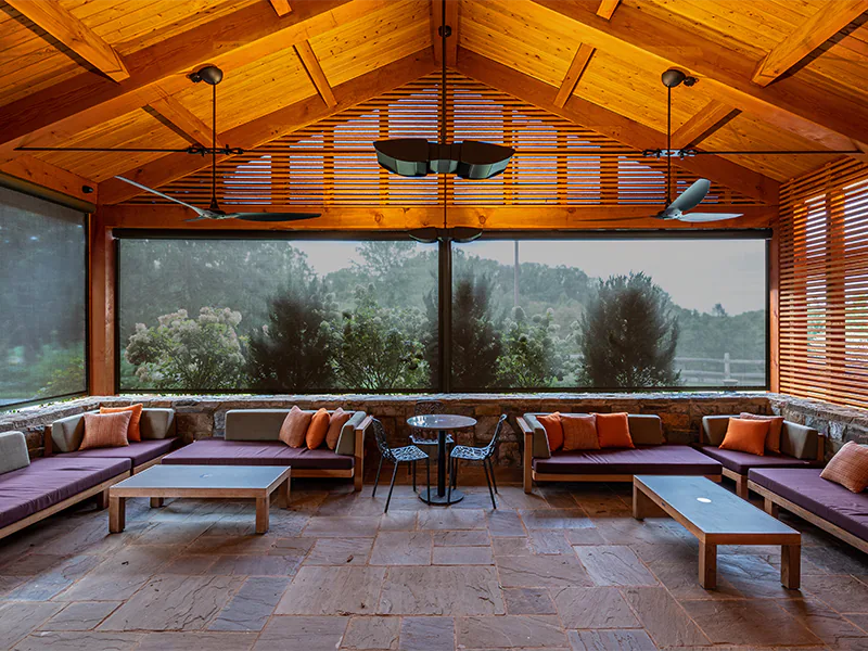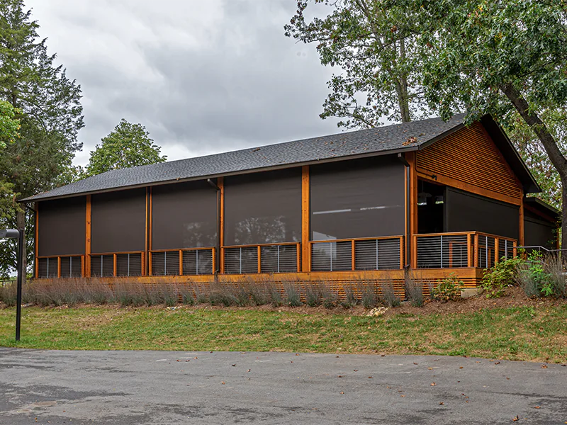 Even though the decks are covered, rain can sometimes be an issue, especially closer to the outer edges. To get the most out of the covered decks there needed to be a way to keep out the rain while preserving essential views of the park’s beautiful natural surroundings. Together, Draper and Goodwin Brothers Shades and Specialties, LLC of Rockville, Maryland came up with the perfect solution for the Wolf Trap Foundation: The motorized FlexShade ZIP.
