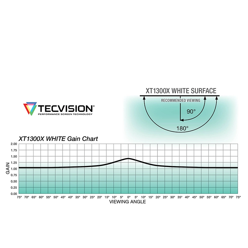 TecVision’s carefully formulated surfaces offer unparalleled performance with individual features that set them apart. Each surface has lower gloss levels and more consistency for better brightness uniformity. The TecVision family offers four ambient light rejecting (ALR) surfaces for optimal image contrast and saturation in spaces with lighting. All gained white surfaces have extremely wide off-axis performance, which provides a huge savings when compared to the cost of purchasing a brighter projector. Each surface has black backing to prevent picture degradation caused from light behind the screen and are available in sizes up to 23’ x 69’ (7 m x 21m). There is a surface to meet the needs of every application within the TecVision family.