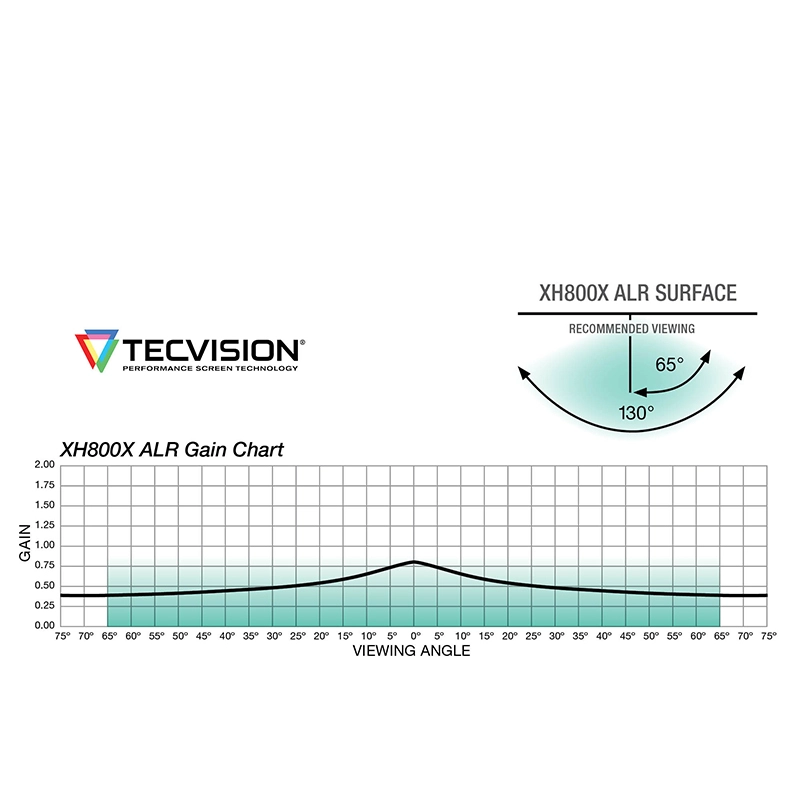 TecVision’s carefully formulated surfaces offer unparalleled performance with individual features that set them apart. Each surface has lower gloss levels and more consistency for better brightness uniformity. The TecVision family offers four ambient light rejecting (ALR) surfaces for optimal image contrast and saturation in spaces with lighting. All gained white surfaces have extremely wide off-axis performance, which provides a huge savings when compared to the cost of purchasing a brighter projector. Each surface has black backing to prevent picture degradation caused from light behind the screen and are available in sizes up to 23’ x 69’ (7 m x 21m). There is a surface to meet the needs of every application within the TecVision family.