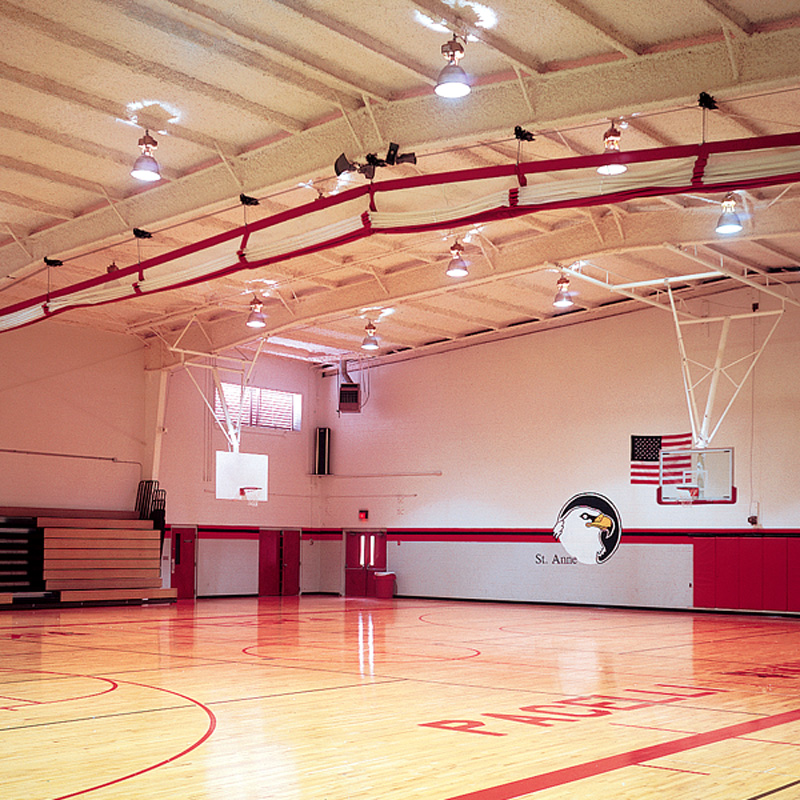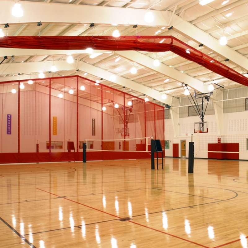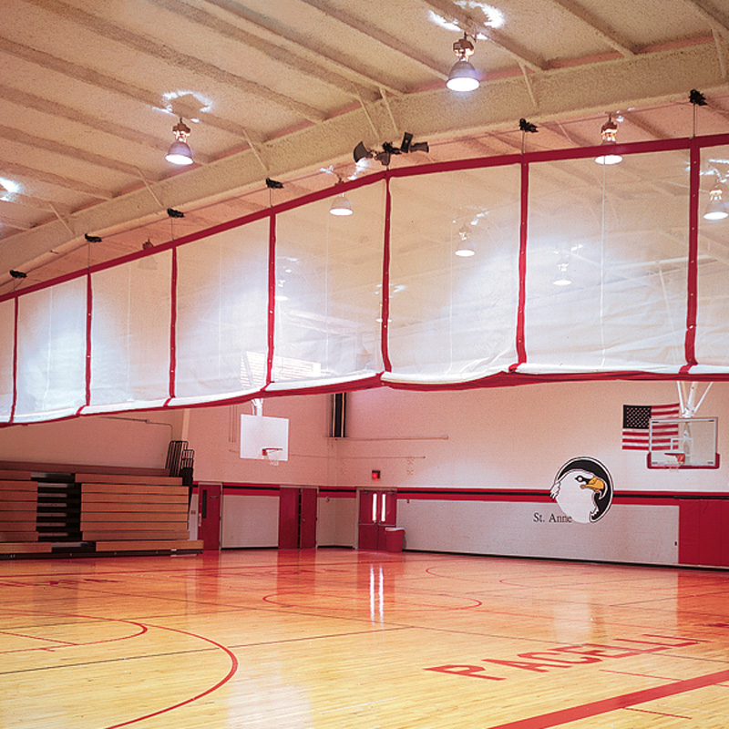 For the most efficient use of space, the Ridge-Fold Gym Divider Curtain provides a custom engineered divider that installs and folds up compactly to conform to the slope of the roof. The design utilizes the approximate angle of the roof structure and provides maximum clearance for all activities. As the bottom tube is raised, lift cables passing through grommets execute an accordion fold-up action that folds the curtain compactly. The accordion fold provides a smoother, more blended transition and years of reliable service. Custom designed winch with individual cable drums eliminate the need for level drive pipe suspended at lowest height.