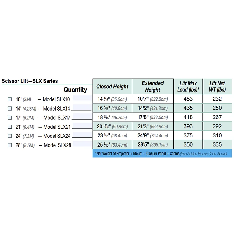 • Choose from six models with extension capacities: SLX10 (10' / 305 cm), SLX14 (14' / 427 cm), SLX17 (17' / 518 cm), SLX21 (21' / 640 cm), SLX24 (24' / 732 cm), and SLX28 (28' / 853 cm).