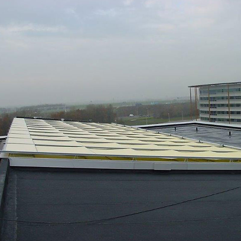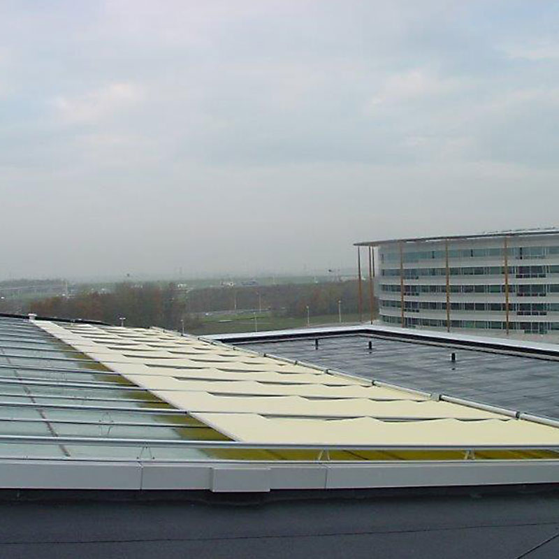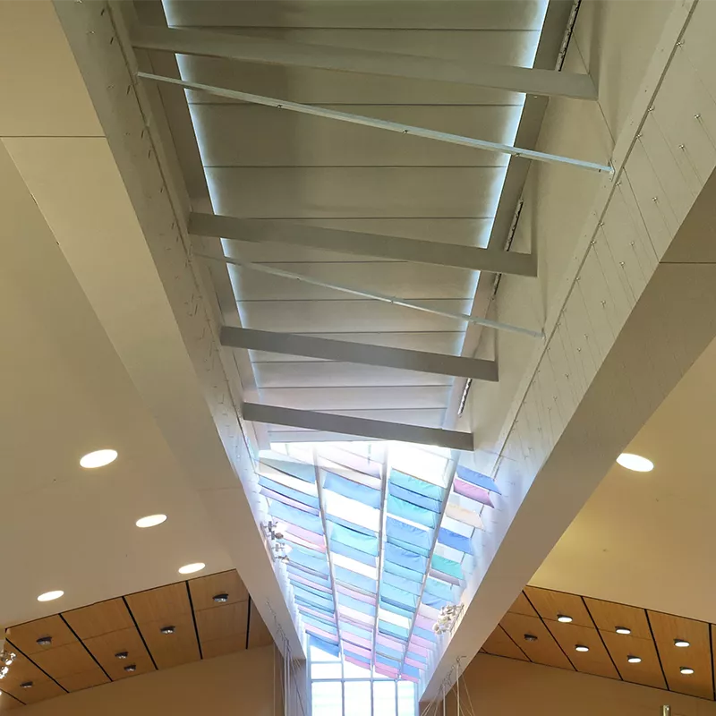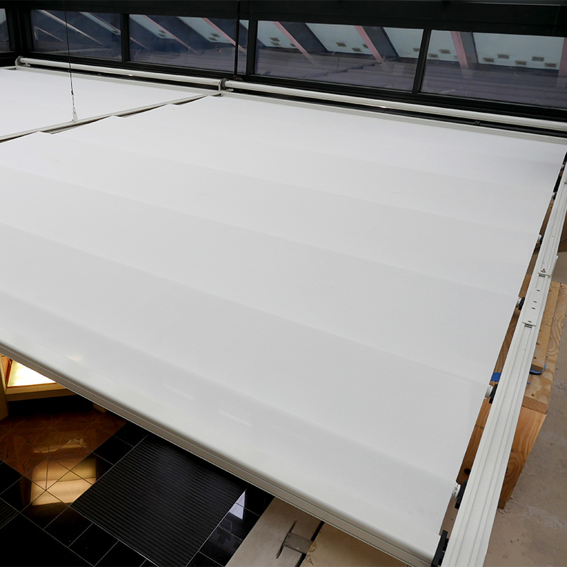 Fabric panels installed onto spring loaded roller tubes at regular intervals for fabric support.